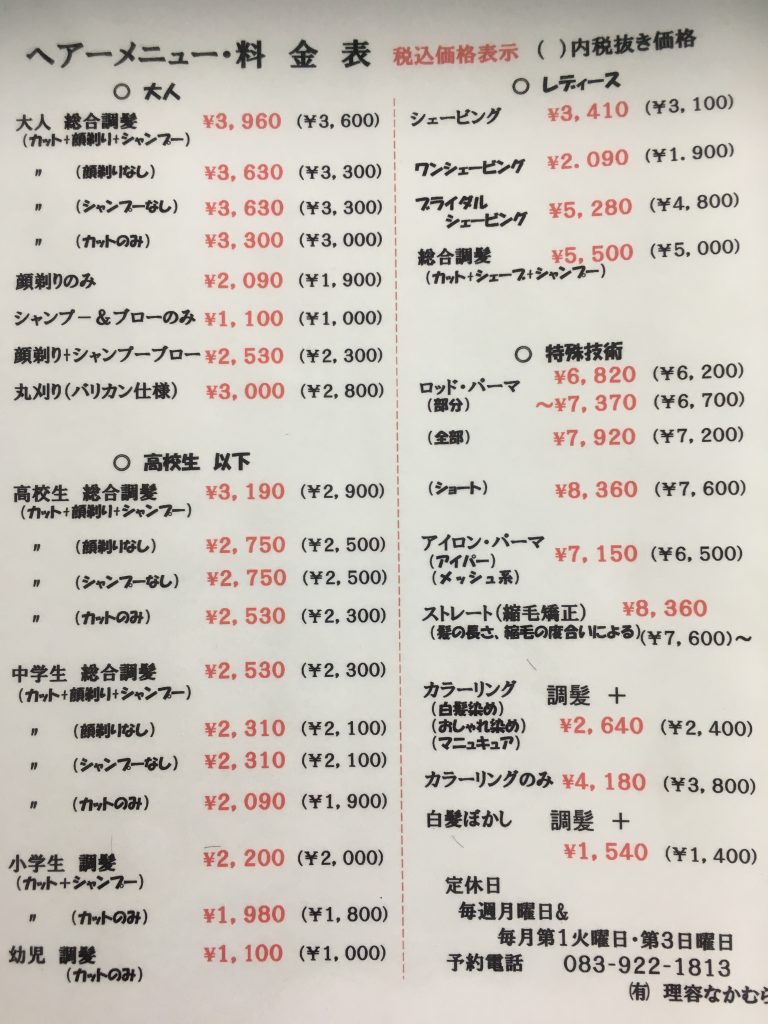 消費増税に伴い一部の料金が変更になります 理容白石since1967 榛原郡吉田町の理容店